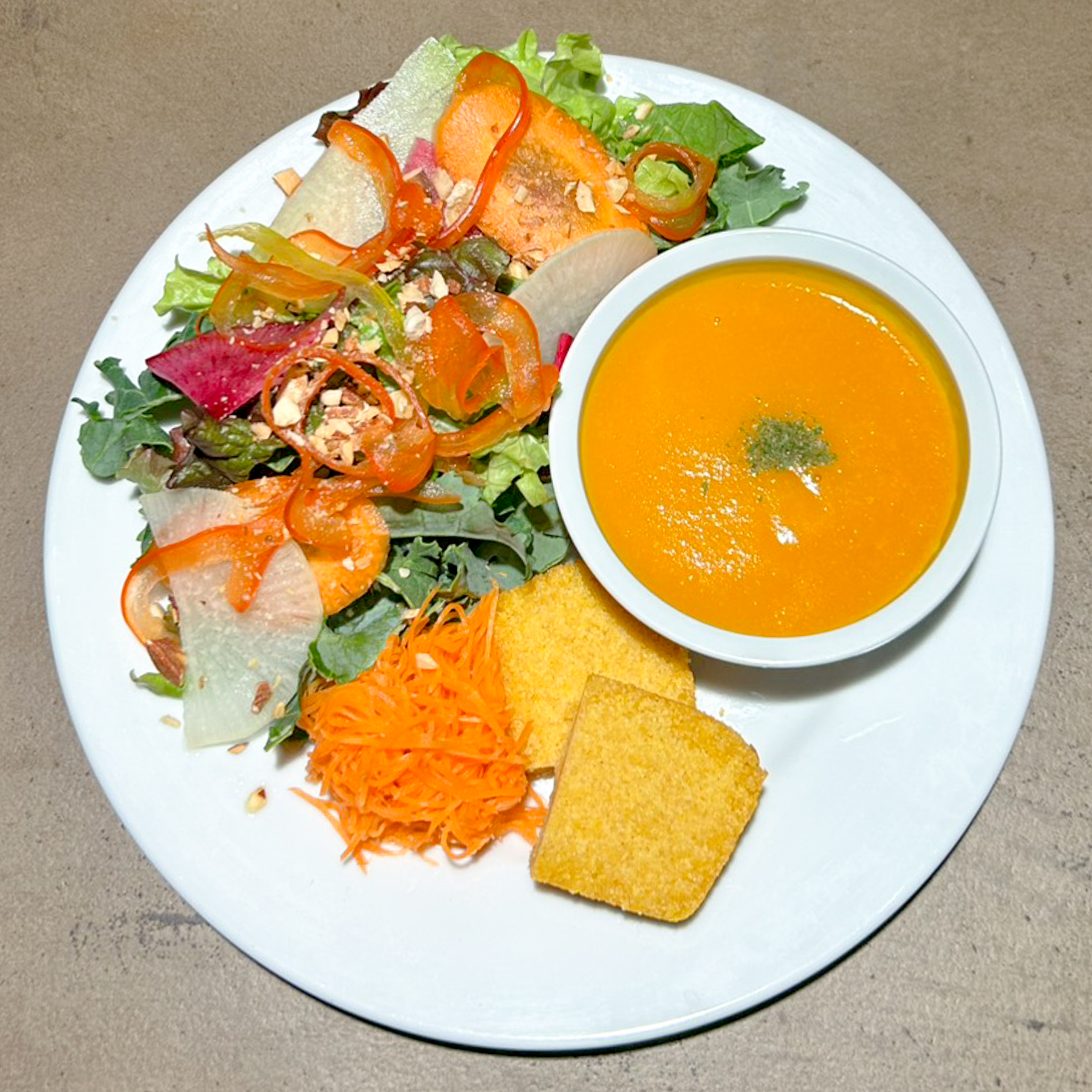 たっぷりサラダと冷菜、季節野菜のスープ、コーンブレッドが一つになったプレート。日替わりの詳細はスタッフにお尋ねください。